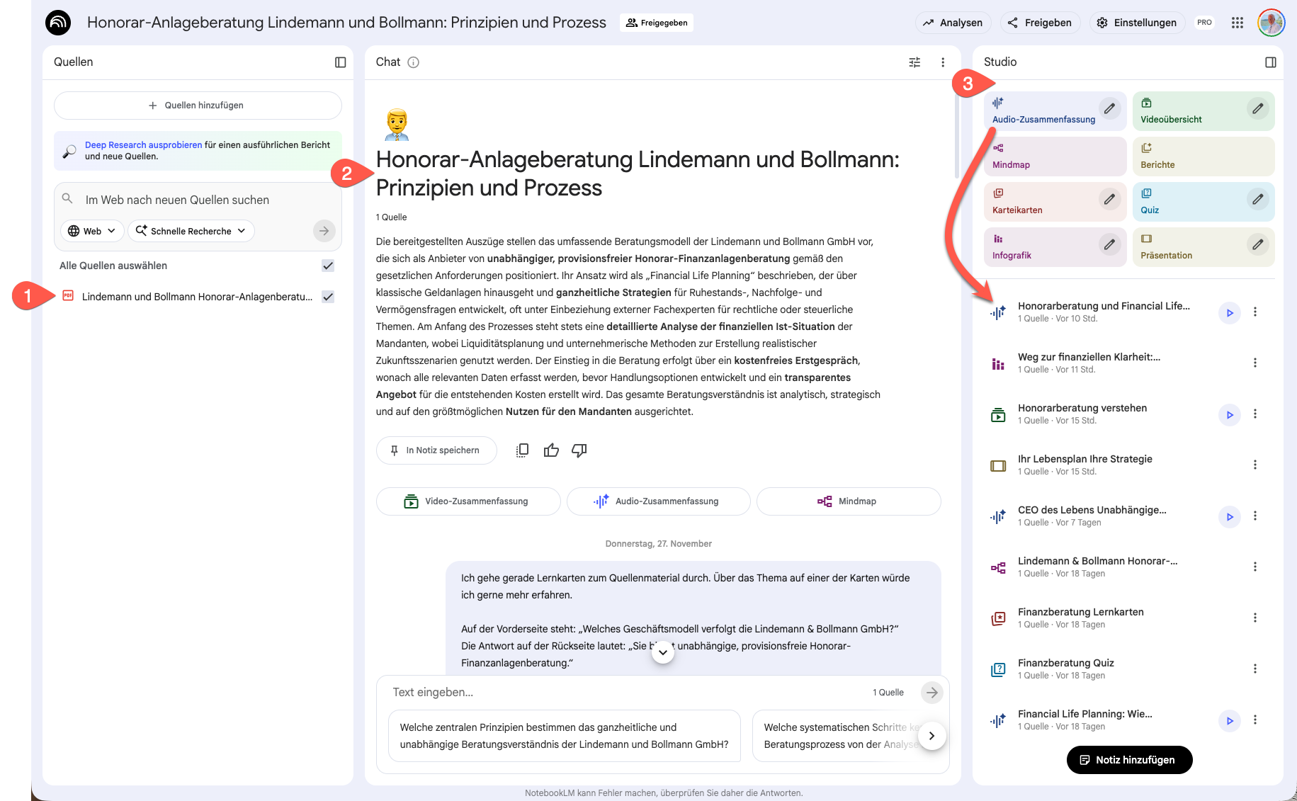 In Spalte (2) - im "Chat" - fertigt Google automatisch eine Zusammenfassung an. Hier kann man weitere "Fragen an die Assets" stellen.